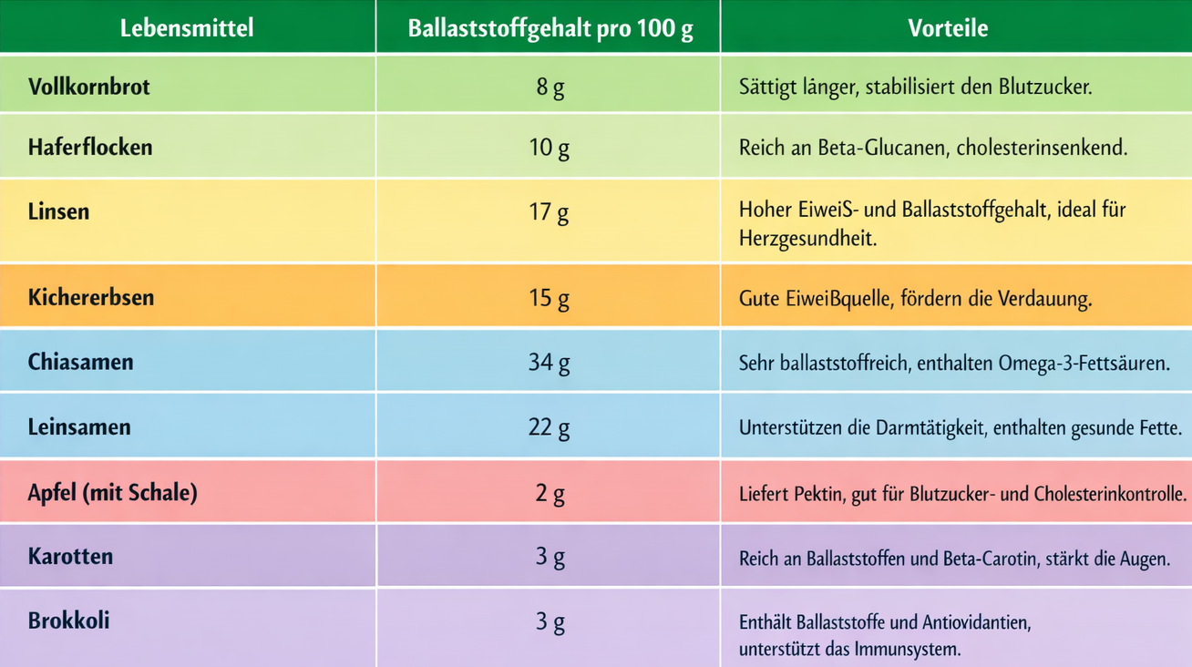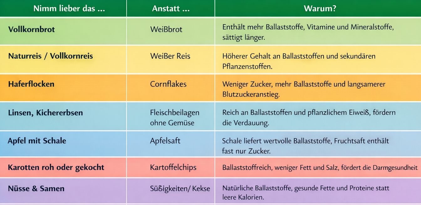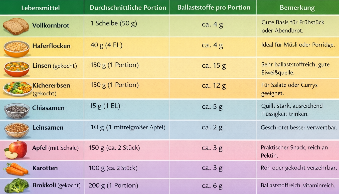 • Beispiel: 2000 kcal/Tag → ca. 30 g Ballaststoffe