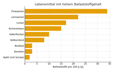 Wenn du dir einen Überblick verschaffen möchtest, wie viel Gramm an Ballaststoffen in typischen Lebensmitteln enthalten sind schau dir die folgende Tabelle an: