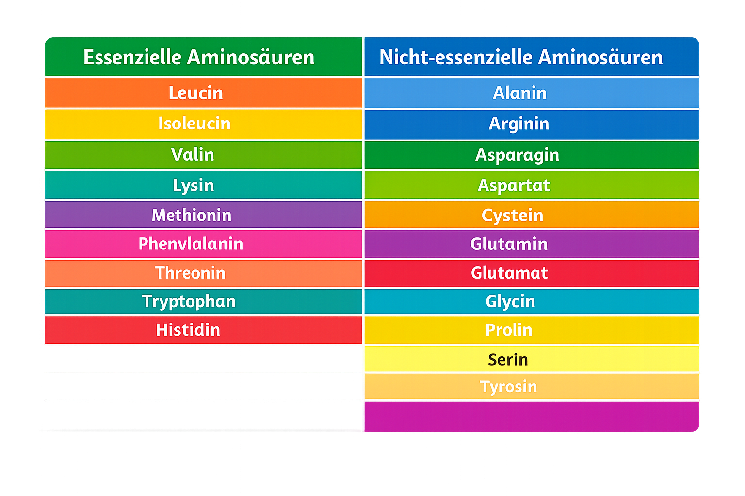 Bausteine: Aminosäuren – es gibt 20 verschiedene, davon 9 essenzielle Aminosäuren, die der Körper nicht selbst herstellen kann und über die Nahrung aufnehmen muss.