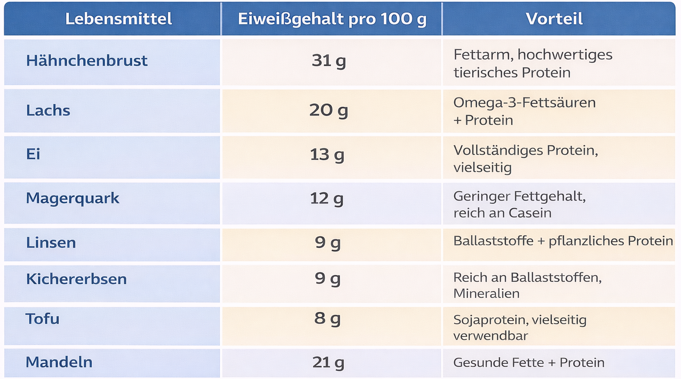 Wenn du dir einen Überblick verschaffen möchtest, wie viel Gramm an Eiweiß in typischen Lebensmitteln enthalten sind schau dir die folgende Tabelle an: