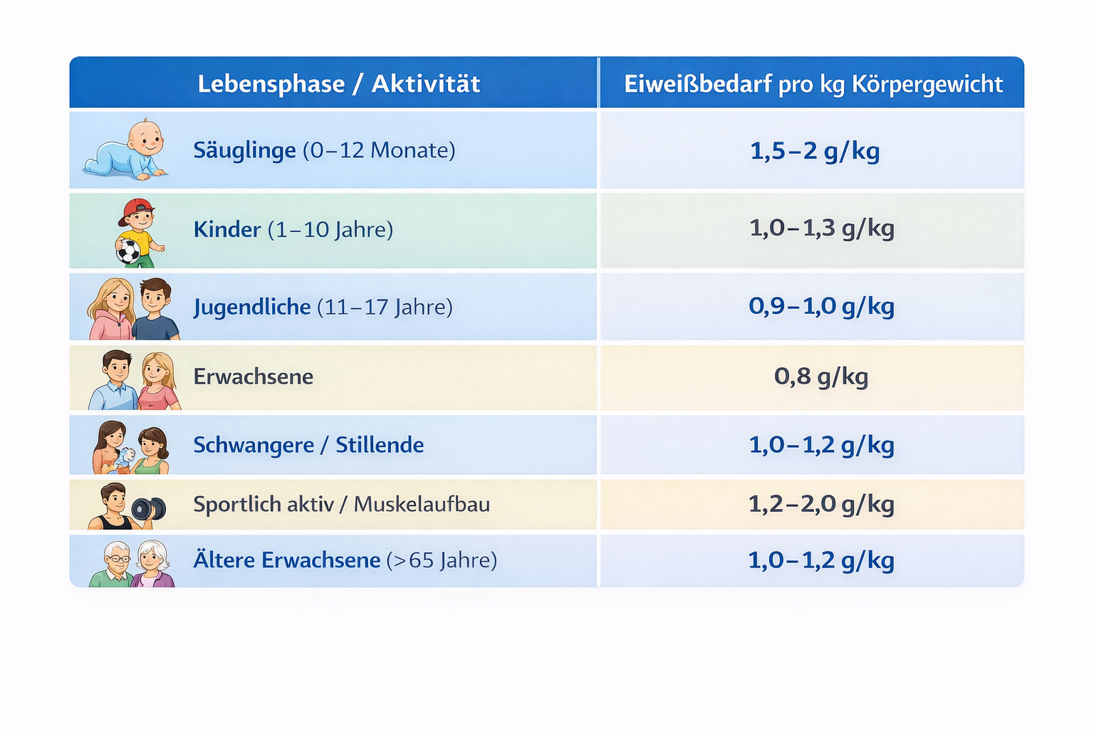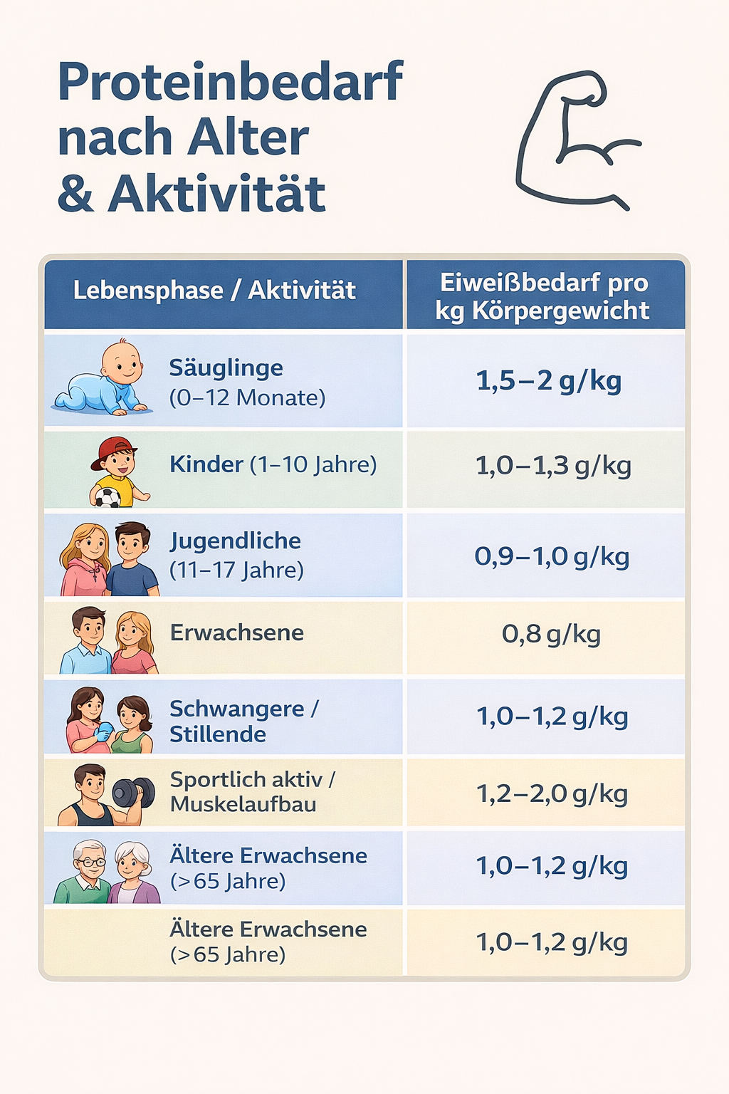 Hinweis: Bei sehr intensiver körperlicher Aktivität oder Krafttraining kann der Bedarf höher sein (bis 2 g/kg).