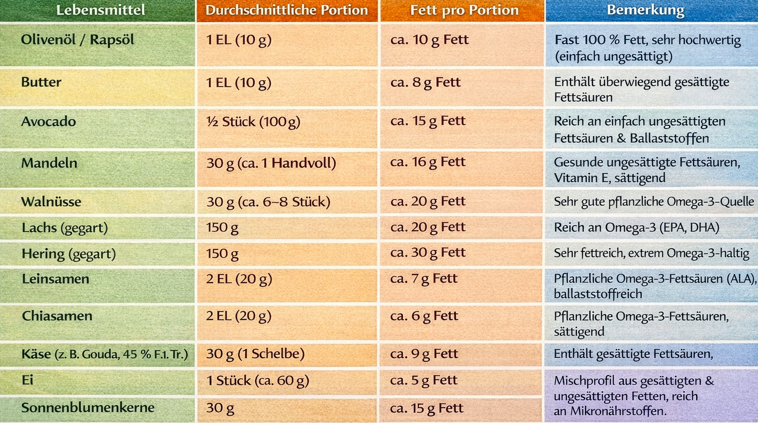 Wenn du dir einen Überblick verschaffen möchtest, wie viel Gramm an Fett in typischen Lebensmitteln enthalten sind schau dir die folgende Tabelle an: