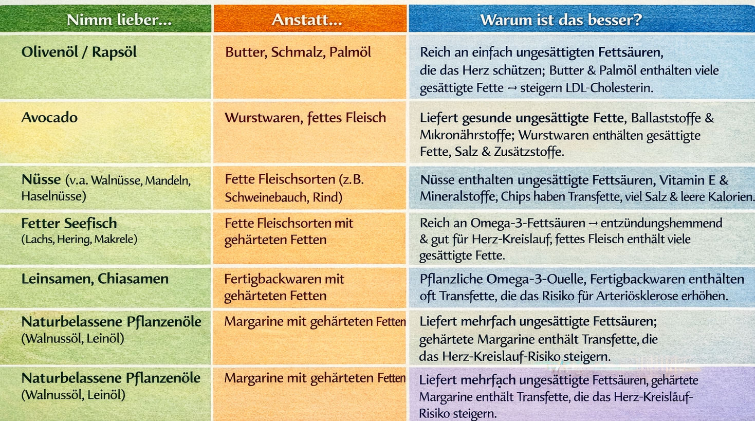 - Transfette: Sollten möglichst vermieden werden – erhöhen LDL und senken gleichzeitig HDL („gutes Cholesterin“).