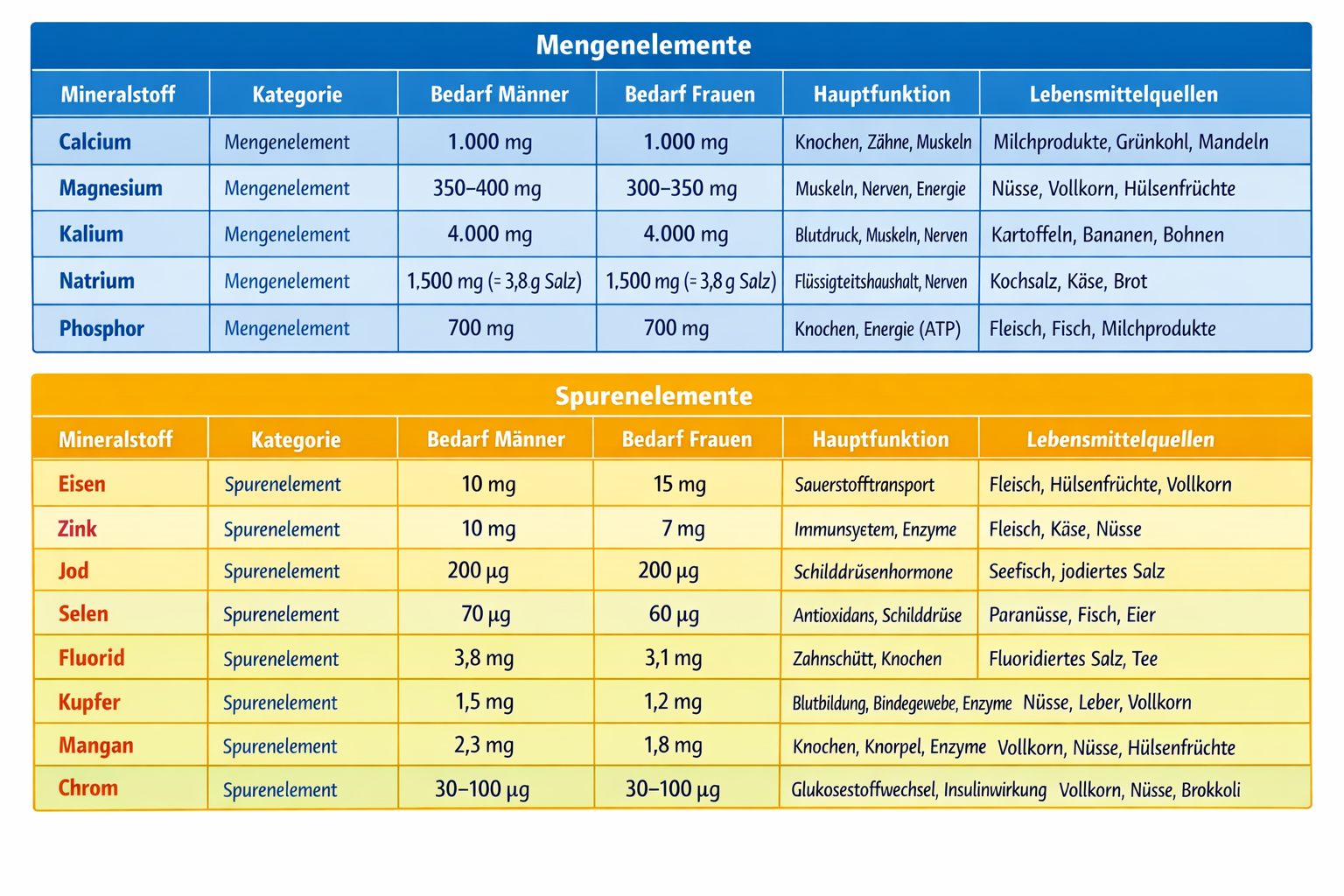 Spurenelemente: < 50 mg pro Tag benötigt (z. B. Eisen, Zink, Jod, Selen, Kupfer, Fluorid, Chrom, Mangan, Molybdän).